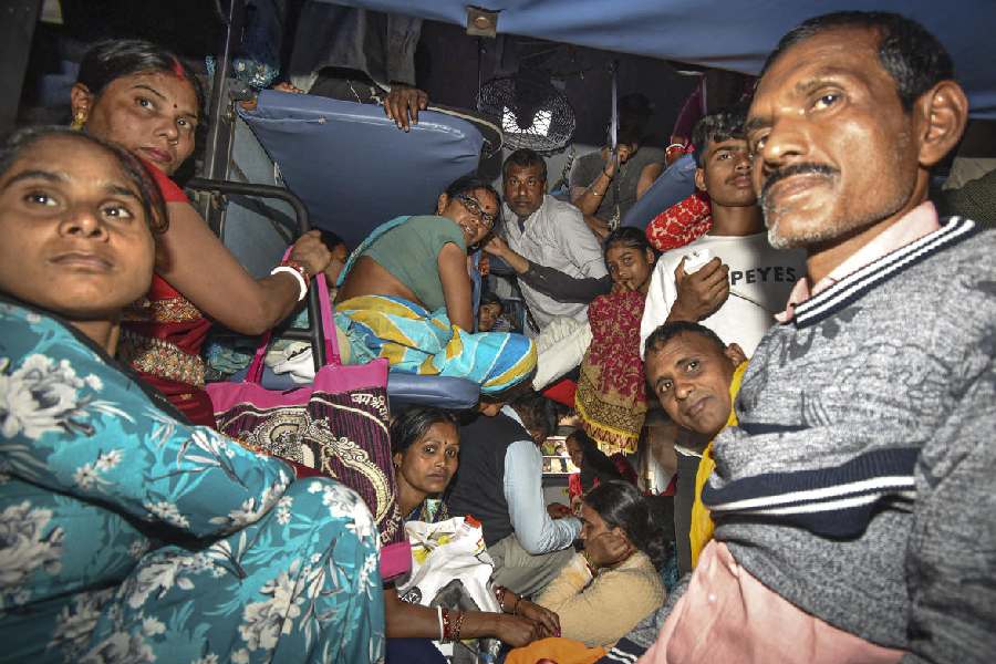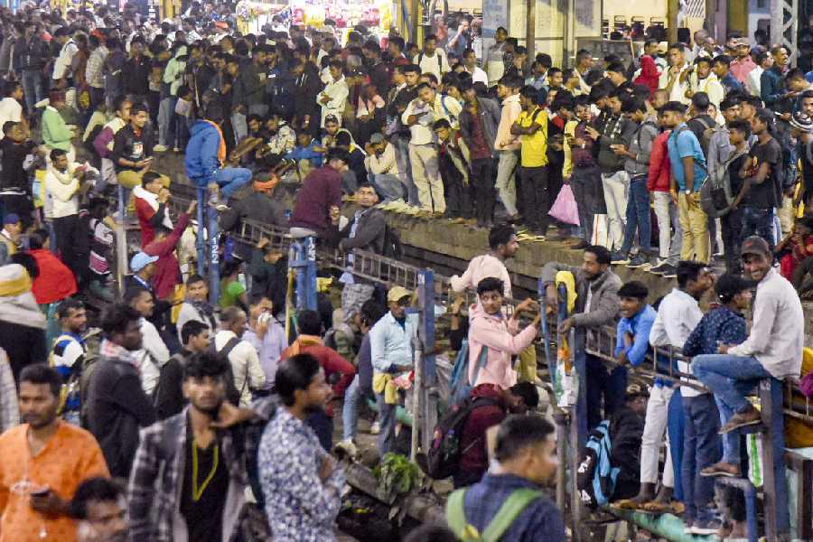 Passengers wait for their trains amid a massive rush owing to the ongoing Prayagraj's Mahakumbh Mela, at Patna railway station, Tuesday, Feb. 18, 2025.