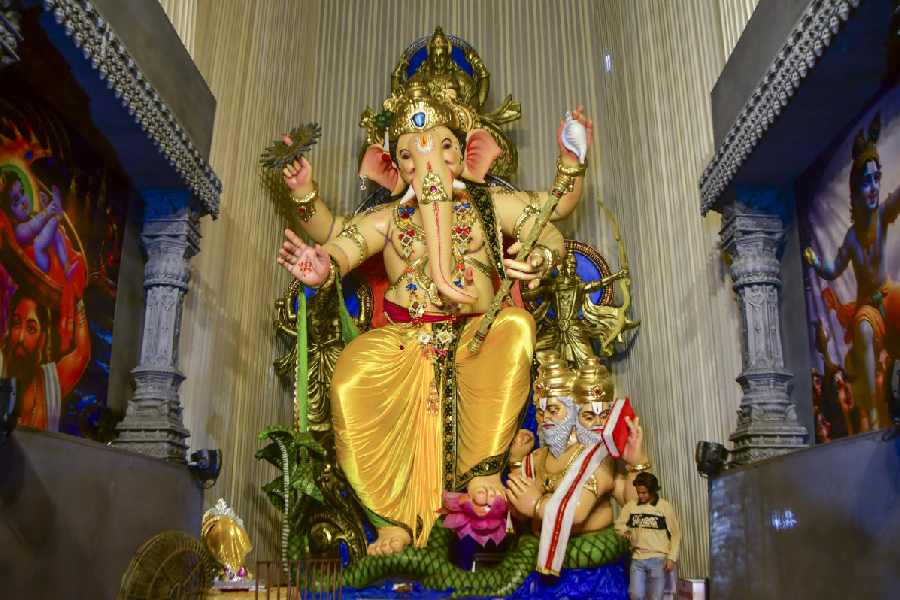 In Pune, a beautifully decorated chariot carried the idol of ‘Shrimant Dagdu Sheth Ganapati’ to the mandap, themed on Kerala’s Padmanabhaswamy temple.