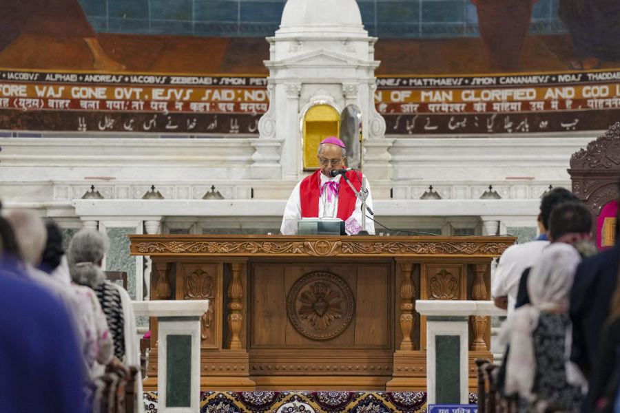 People offer prayers during Good Friday mass at Sacred Heart Cathedral Church, in New Delhi, Friday, April 18, 2025.