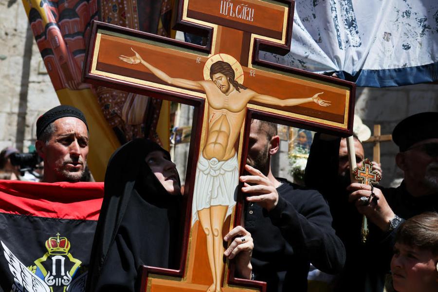 Worshippers carry crosses during the Christian Good Friday procession in Jerusalem's Old City, April 18, 2025.