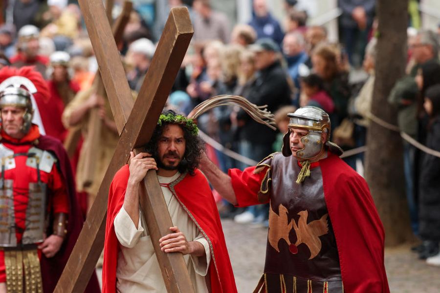 Members of the Italian community take part in a re-enactment of the crucifixion of Jesus Christ on Good Friday in Bensheim, southwest of Frankfurt, Germany, April 18, 2025.