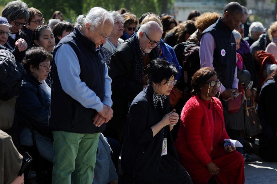 People pray during a Good Friday "Stations of the Cross" procession in front of the Notre-Dame de Paris Cathedral in Paris, France, April 18, 2025.