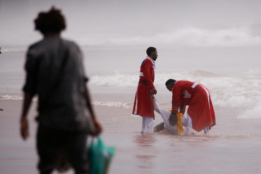 Church elders baptise a worshipper on the beach on Good Friday in Durban, South Africa, April 18, 2025.