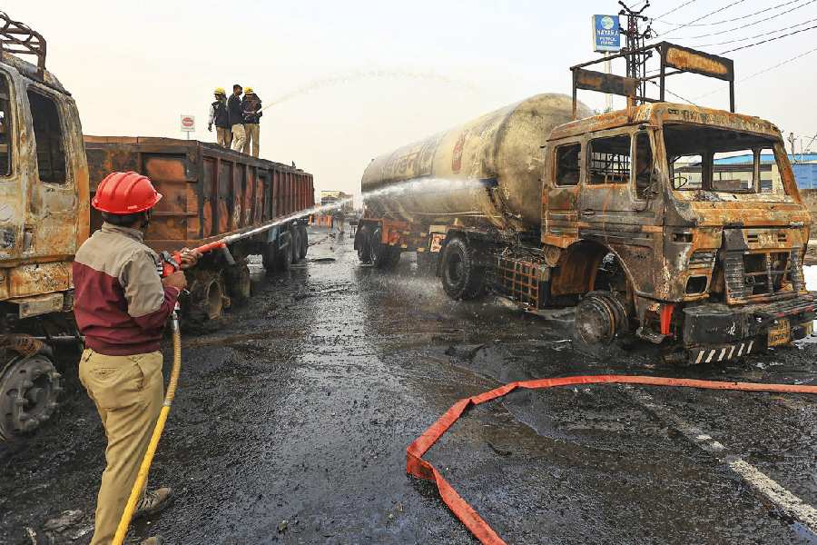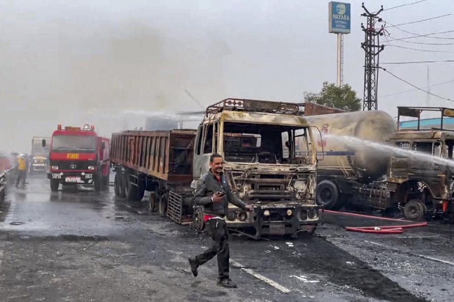 A LPG tanker collided with multiple vehicles on Friday, leading to a massive fireball that turned a stretch of the Jaipur-Ajmer highway into an inferno, killing at least eleven people and engulfing more than 30 vehicles in flames.