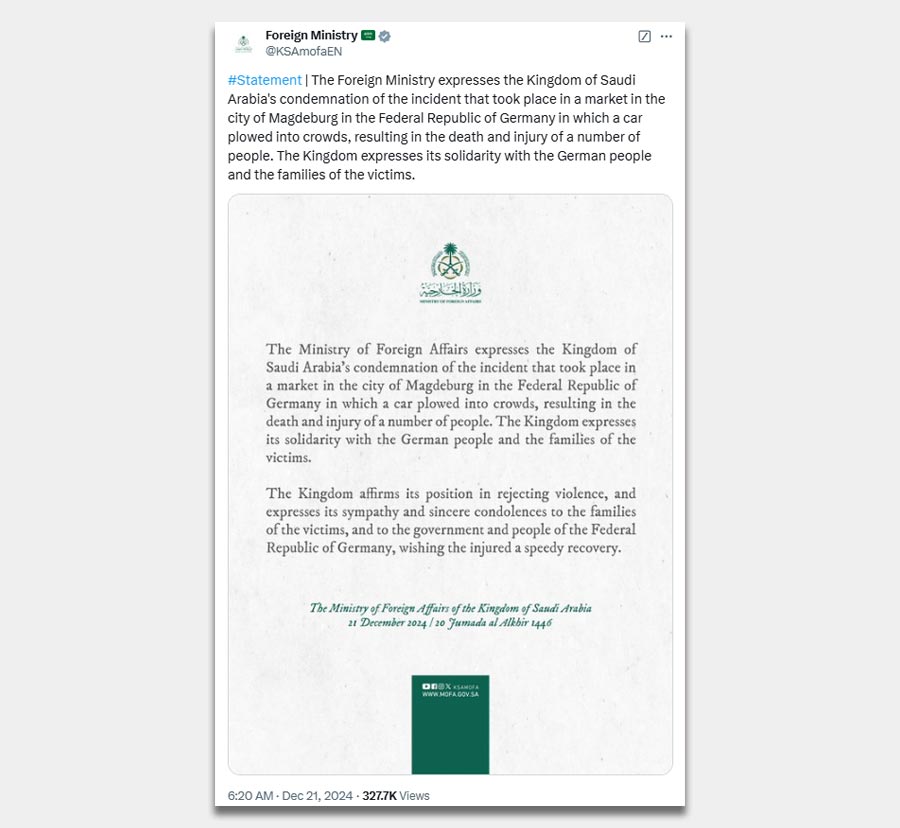 A Saudi source told Reuters the kingdom had warned German authorities about the attacker, who the source said had posted extremist views on his personal X account.