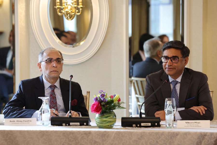 Foreign Secretary Vikram Misri and India's Ambassador to the US Vinay Mohan Kwatra during a meeting with a delegation, in Washington, DC.