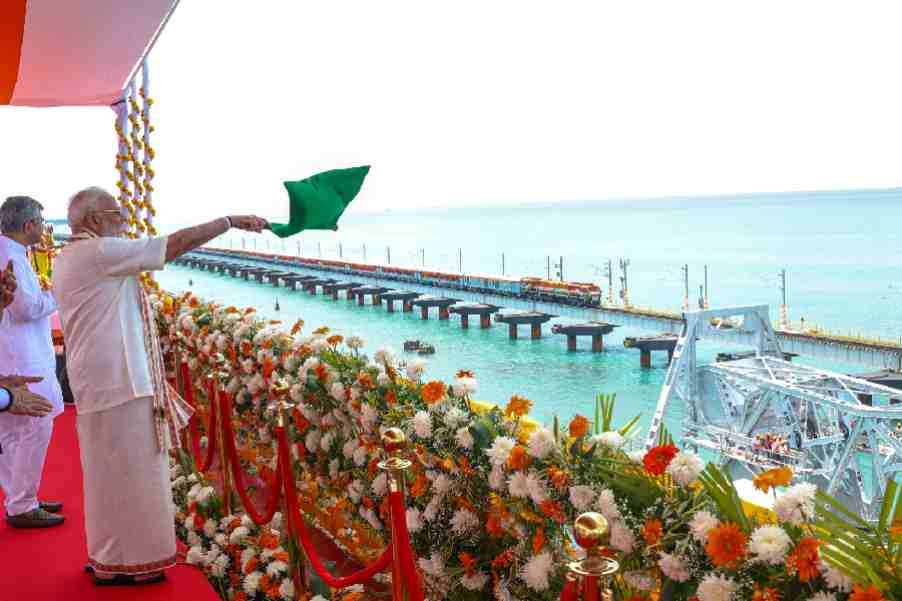 Prime Minister Narendra Modi on Sunday inaugurated the Pamban sea bridge in Tamil Nadu, providing a rail link between Rameswaram island and the mainland, and also flagged off the new Rameswaram-Tambaram (Chennai) train service on the occasion of Ram Navami.