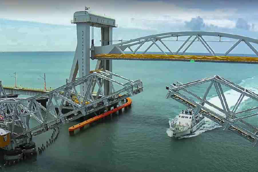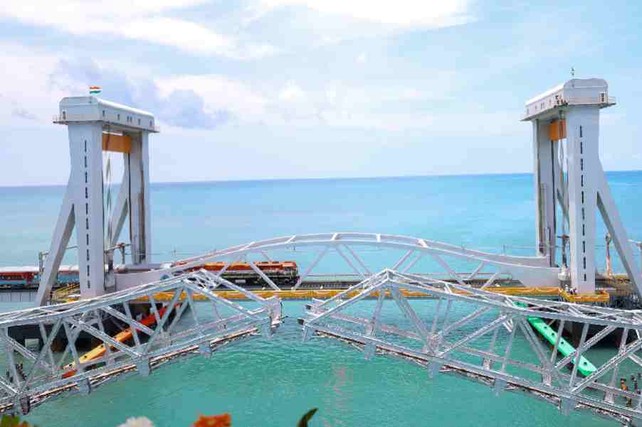 Spanning the Palk Strait, 2.08 kilometers, the bridge comprises 99 spans and a 72.5-meter-long vertical lift span that can be raised up to 17 meters, allowing the smooth passage of large ships while ensuring seamless train operations.