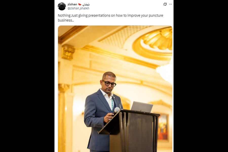Another followed: “Nothing, just giving presentations on how to improve your puncture business,” alongside a photo of himself addressing a conference room.