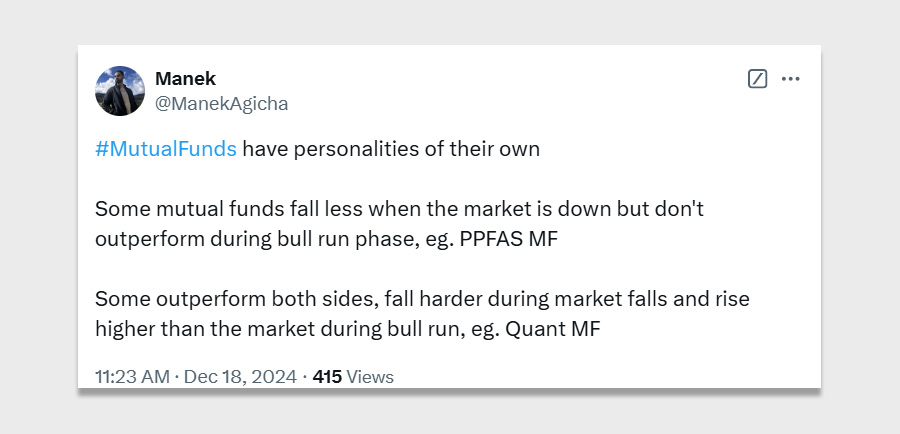 One witty post compared mutual funds to humans. “#MutualFunds have personalities of their own Some mutual funds fall less when the market is down but don't outperform during bull run phase, eg. PPFAS MF Some outperform both sides, fall harder during market falls and rise higher than the market during bull run,” said the post