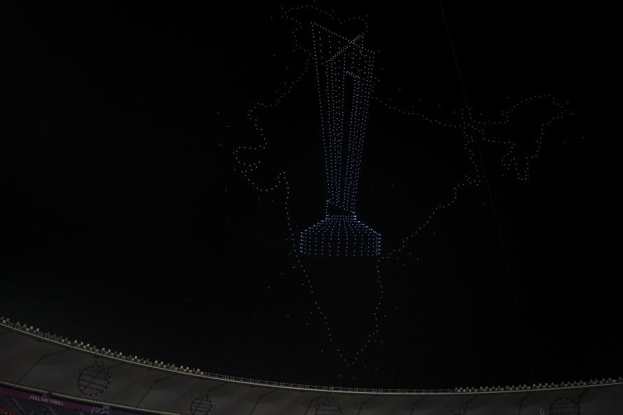 Drones light up the sky above the Narendra Modi Stadium after India won the ICC Men's T20 World Cup 2026, in Ahmedabad, Gujarat, Sunday, March 8, 2026.
