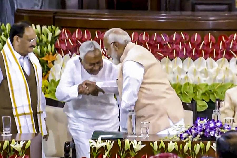 Senior BJP leader Narendra Modi with Bihar CM and JD(U) leader Nitish Kumar during the NDA parliamentary party meeting at Samvidhan Sadan, in New Delhi on June 7.