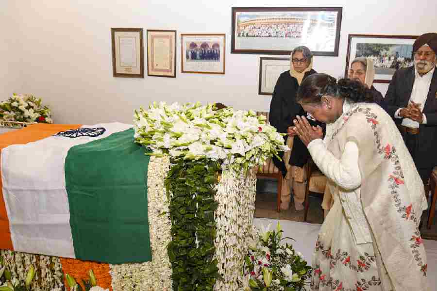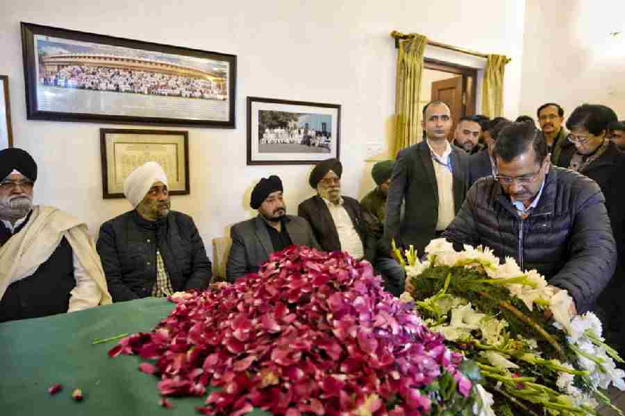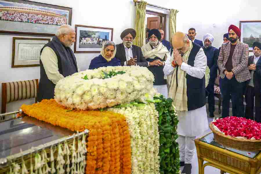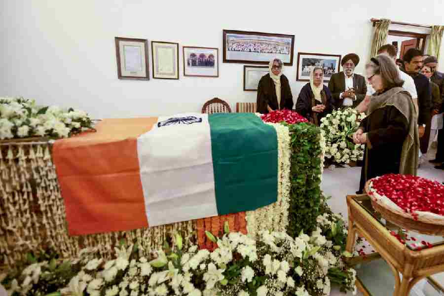 Draped in the tricolour, Singh's body was placed in a flower-bedecked casket at the bungalow, where leaders cutting across party lines paid their last respects to the departed leader in the presence of his wife Gursharan Kaur and other family members.