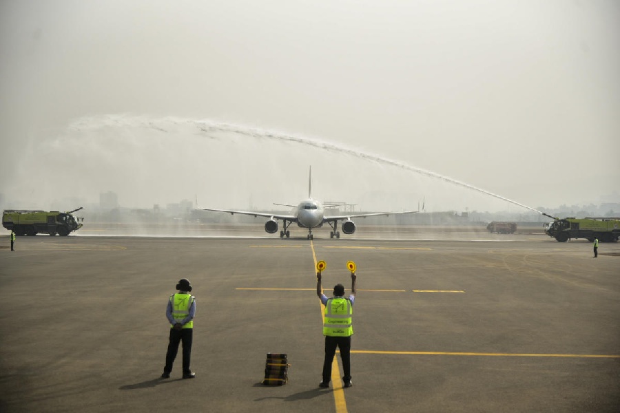The aircraft was welcomed with the traditional water salute by two Crash Fire Tenders (CFT) of NMIA.