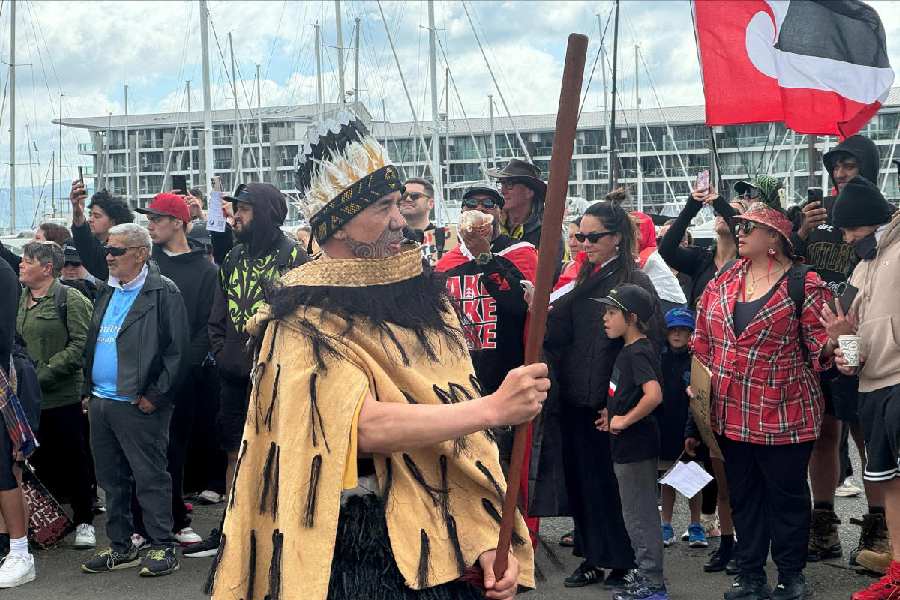 Some people were dressed in traditional attire with feathered headgear and cloaks and carried traditional Maori weapons, while others wore t-shirts emblazoned with Toitu te Tiriti (honour the treaty).