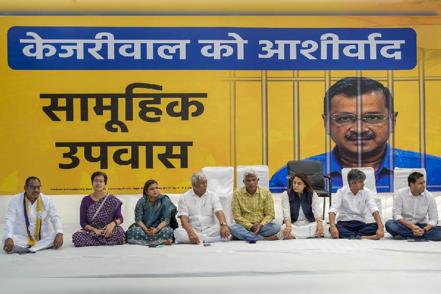 Top leaders of Aam Aadmi Party gathered at Jantar Mantar here on Sunday for a day-long fast to protest against the arrest of Delhi Chief Minister and the party's national convener Arvind Kejriwal. Many senior AAP leaders, including Delhi Assembly Speaker Ram Niwas Goel, Deputy Speaker Rakhi Bila, ministers Atishi, Gopal Rai and Imran Hussain attended the day-long 'Samuhik Upwas' at Jantar Mantar in the national capital from 11 am.