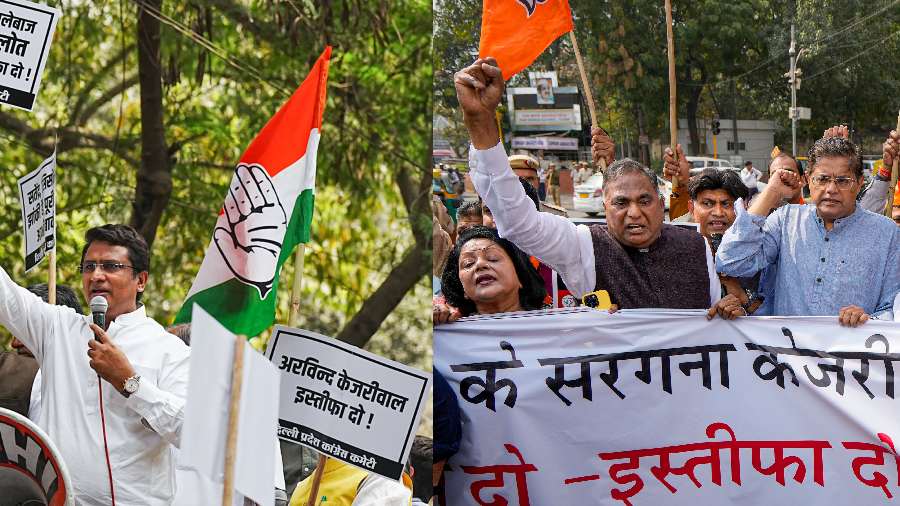The Congress in Delhi on Wednesday staged a protest near the Aam Aadmi Party office here, demanding the resignation of Chief Minister Arvind Kejriwal following the arrest of his deputy Manish Sisodia by the CBI.