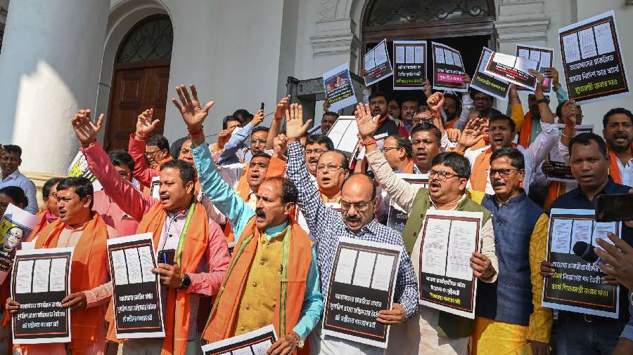 The BJP on Monday staged a walkout from the West Bengal assembly when its demand for tabling an adjournment motion to discuss the entire teaching job scandal issue in state schools was rejected.