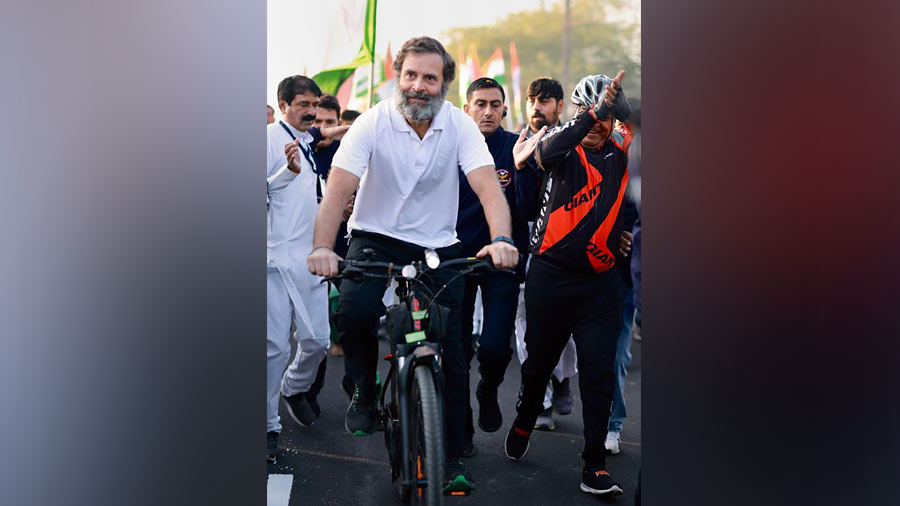 A cyclist joined the yatra here and Gandhi was seen riding his bicycle briefly.Famous Urdu poet Rahat Indori's son Satlaj Rahat also joined the yatra and said he presented to Rahul Gandhi two books dedicated to his late father, including the latter's autobiography.