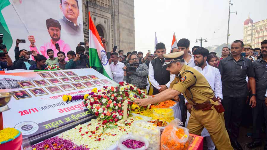 Maharashtra Governor Bhagat Singh Koshyari and Chief Minister Eknath Shinde on Saturday paid floral tributes to the martyrs who laid down their lives while fighting terrorists who had attacked the metropolis on this day 14 years ago.