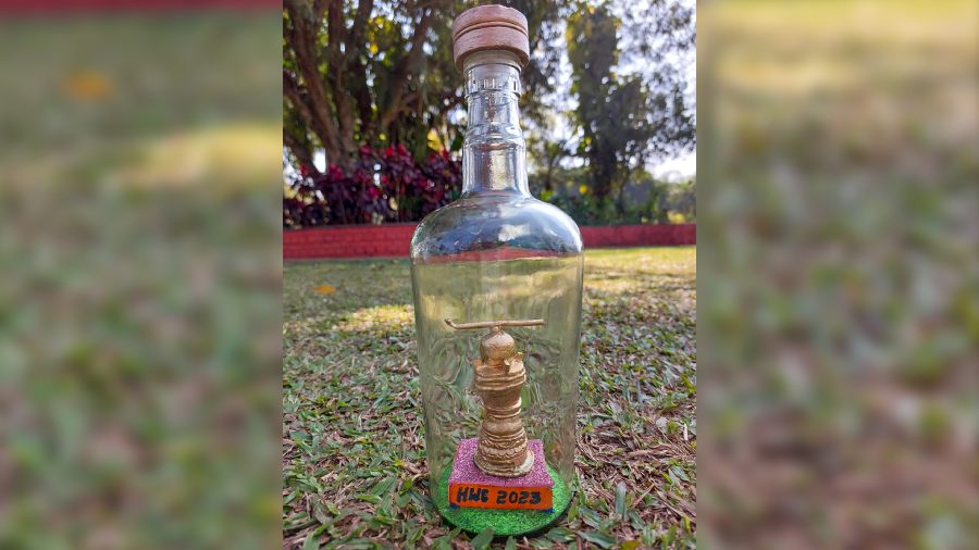 Odisha-based artist L Eshwar Rao has carved a miniature hockey stick and ball and placed it inside a 750 ml bottle to wish 'Best of Luck' to all teams participating in the World Cup.
