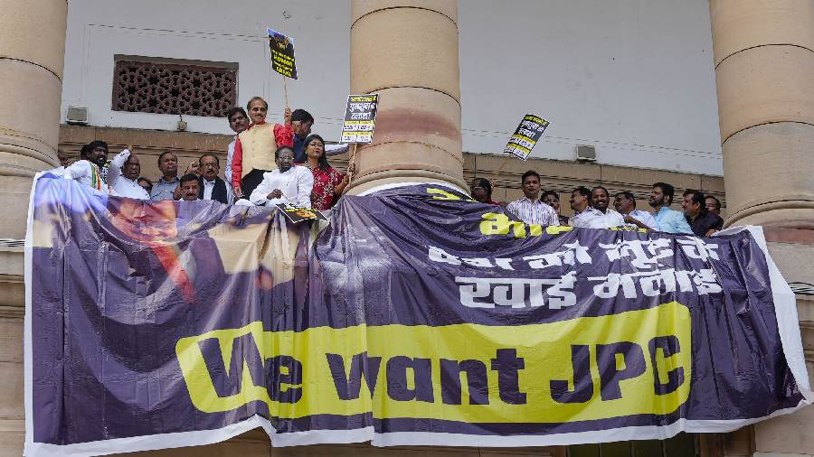 Several opposition party leaders on Tuesday held a protest in the corridors of Parliament House and raised slogans demanding a Joint Parliamentary Committee (JPC) probe into the Adani issue. They also hung a banner that read "We want JPC" from the first floor of Parliament building.