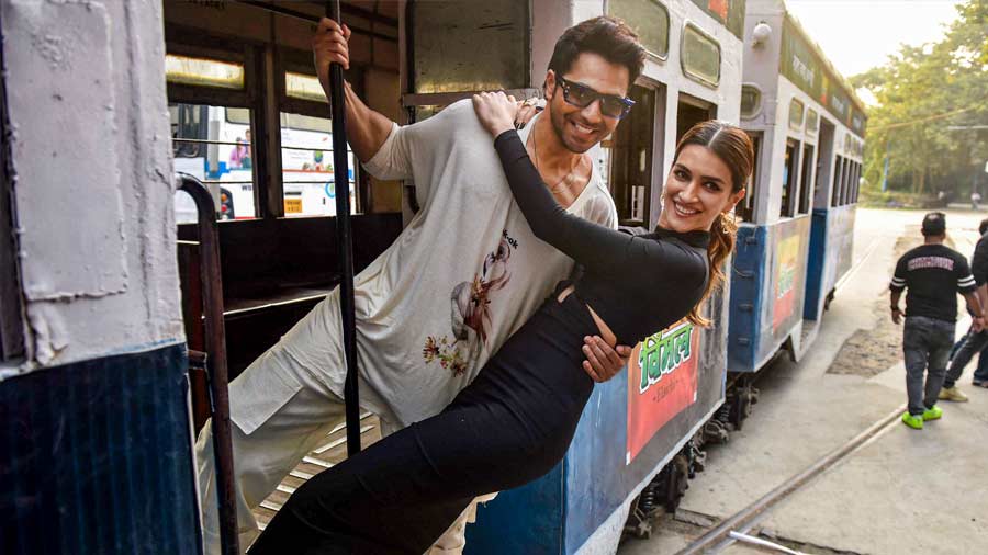 Bollywood actors Varun Dhawan and Kriti Sanon pose for photos during the promotions of their upcoming film 'Bhediya', in Kolkata