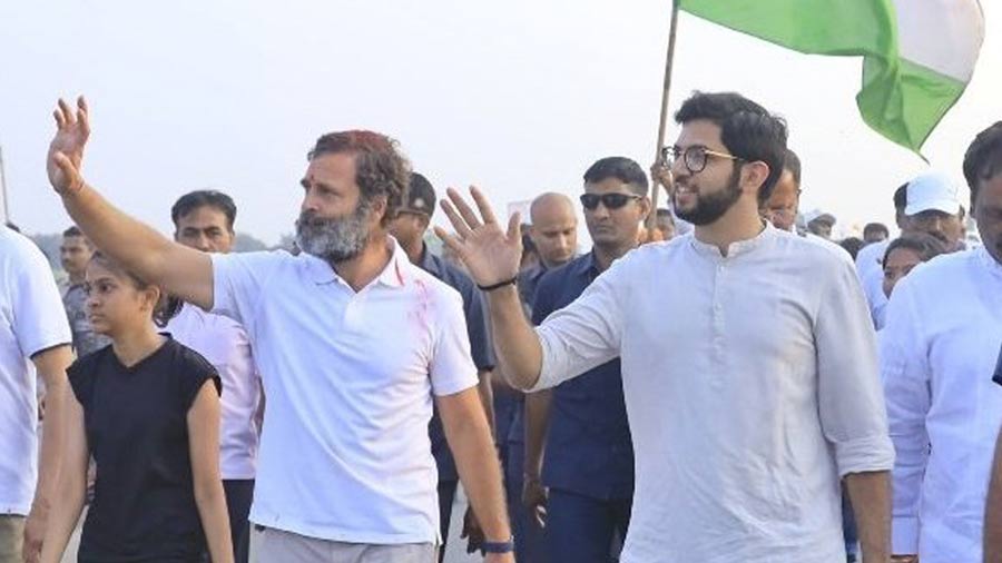 Shiv Sena (Uddhav Balasaheb Thackeray) leader and former Maharashtra minister Aaditya Thackeray joined the Congress' 'Bharat Jodo Yatra' at Kalamnuri in Hingoli, where the march arrived during the day from neighbouring Nanded district, and walked along Rahul Gandhi.