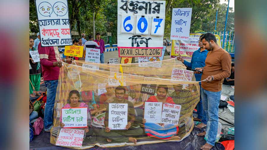 SSC qualified candidates sit inside a mosquito net as a preventive measure against mosquito-borne diseases during their sit-in protest demanding permanent teaching jobs, near the statue of Mahatma Gandhi in Calcutta.
