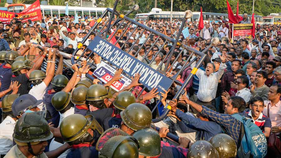 The employees, who had gathered near the downtown Esplanade area of the city, were prevented by the police from proceeding to the Assembly building, officials said.The Kolkata Police set up barricades on the road leading to the assembly house and the employees broke them and marched towards the assembly area, where Section 144 Cr PC is in force.