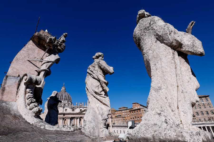 The dome of St. Peter's Basilica and the statues on the "braccio di Carlo Magno" (Charlemagne's wing), on the day Pope Leo XIV leads the Easter Mass in St. Peter's Square at the Vatican, April 5, 2026. (Image by Reuters)