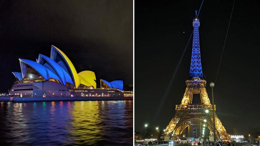 Australia's Sydney Opera House and Pari's Eiffel Tower lit up in the color of the Ukraine flag to show solidarity with Ukraine.