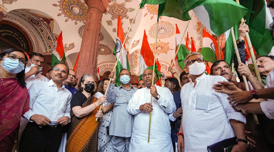 Sonia Gandhi too held the national flag at Parliament's gate number 1 where all opposition MPs gathered before starting the march which was led by Congress chief Mallikarjun Kharge.