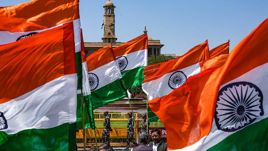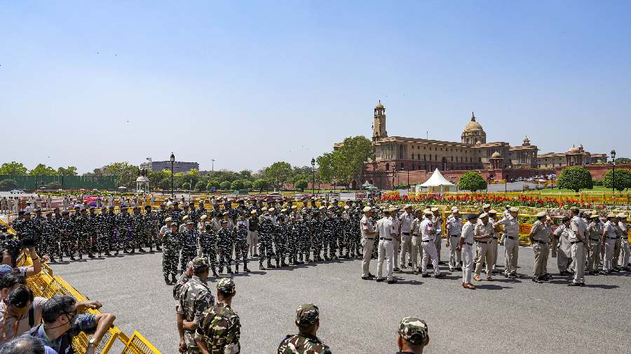Security personnel deployed for the ‘Tiranga March’ of Opposition MPs, on the last day of the Budget session of Parliament, at Vijay Chowk in New Delhi. Opposition parties have been displaying coordination during the Budget Session of Parliament and have jointly held protests ever since it started on March 13.