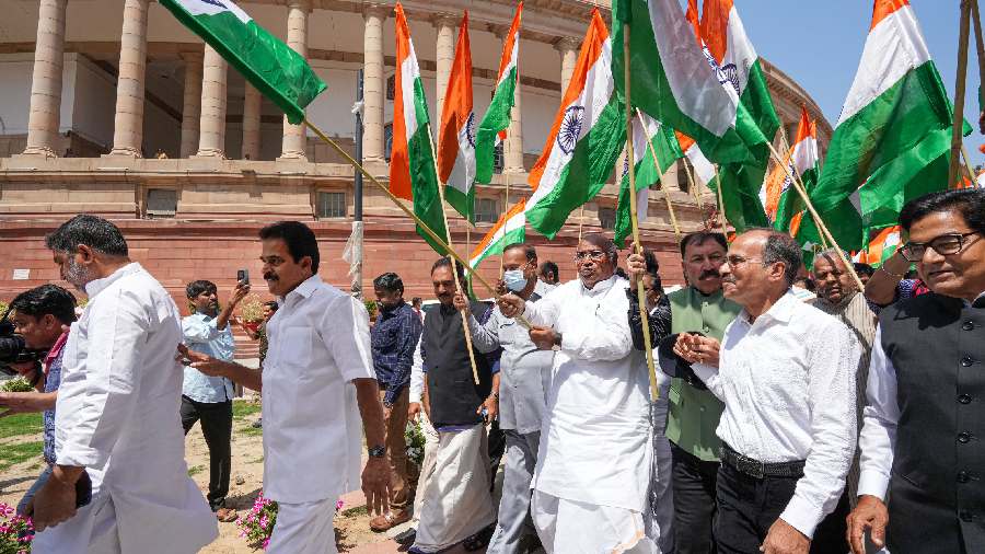 Holding the national flag, MPs of like-minded Opposition parties such as the DMK, the Samajwadi Party, the RJD, Shiv Sena (UBT), AAP and the NCP, and from the Left, besides the Congress, started the march from Parliament House and walked up to Vijay Chowk.