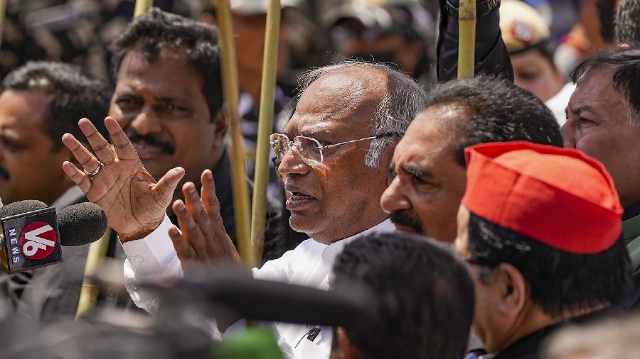 Congress President and Leader of Opposition in Rajya Sabha Mallikarjun Kharge speaks to the media during Opposition MPs' ‘Tiranga March’. They have been unitedly demanding a Joint Parliamentary Committee probe into the Adani issue and have raised the matter both in Lok Sabha and Rajya Sabha, leading to disruptions of proceedings.