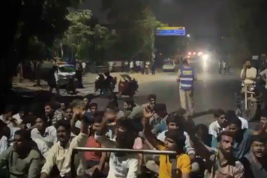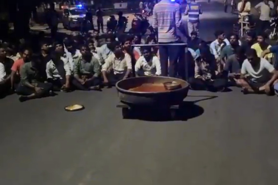 Holding the curry vessel and plate, they blocked the university’s main road, chanting slogans against the administration and urging vice-chancellor Prof. M. Kumar to address their concerns.