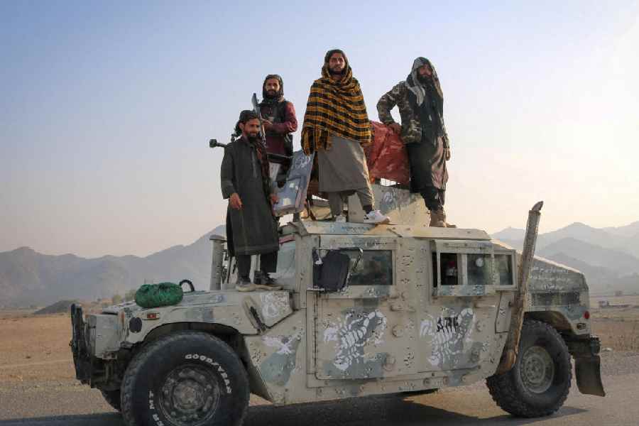 Taliban soldiers pose as they stand on a Humvee, following exchanges of fire between Pakistani and Afghan forces, in Momand Dara, Nangarhar province (Reuters)