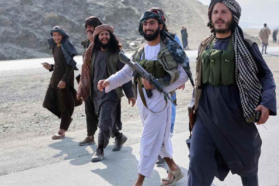 Afghan Taliban soldiers walk along the main road on the Afghan side of the Torkham border crossing with Pakistan in Torkham(Reuters)