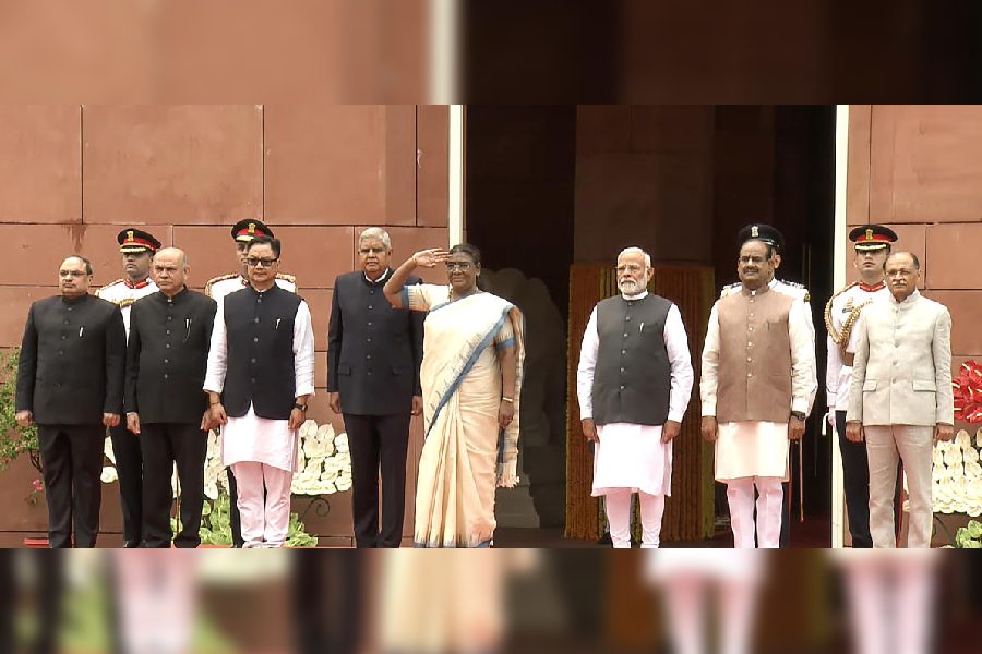 President Droupadi Murmu with Vice President Jagdeep Dhankhar, Prime Minister Narendra Modi, Lok Sabha Speaker Om Birla and Union Minister Kiren Rijiju at the Parliament House complex before her address to the joint sitting of of the Lok Sabha and Rajya Sabha, in New Delhi, Thursday, June 27, 2024. Reflecting on the historical context, President Murmu labelled the 1975 Emergency as the "darkest chapter" in India's democratic journey. She lauded the nation's resilience in overcoming such unconstitutional challenges, emphasising the strength of India's democratic fabric.
