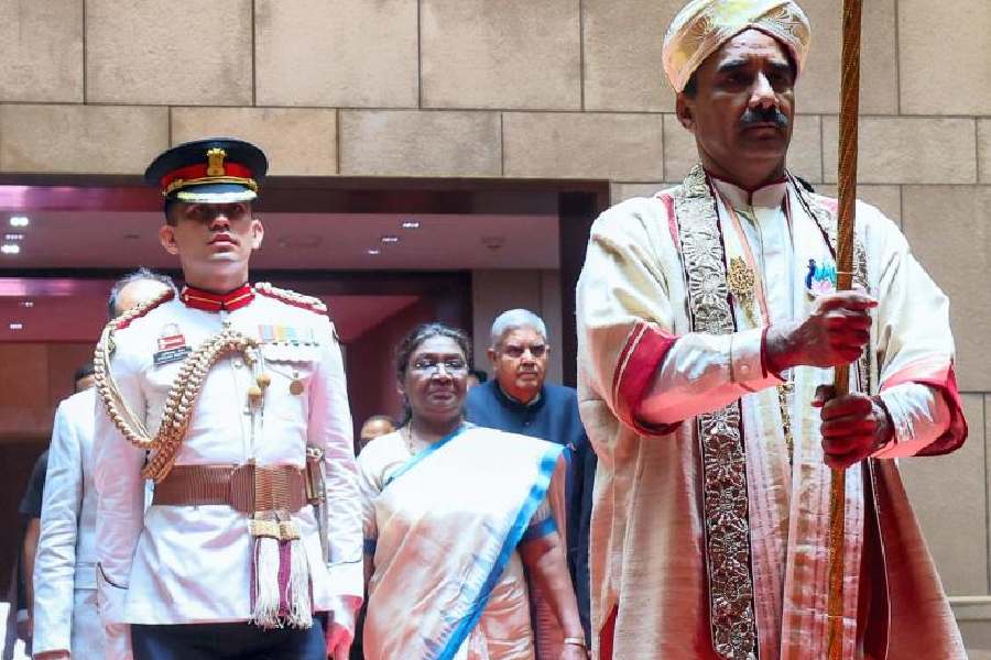 President Droupadi Murmu along with Vice President Jagdeep Dhankhar proceeds to address the joint sitting of the Lok Sabha and Rajya Sabha, in New Delhi. President Droupadi Murmu highlighted the high voter turnout in Jammu and Kashmir in the Lok Sabha elections and said Kashmir has given a befitting reply to the enemies of India by breaking polling records of many decades. Murmu also said the Constitution has fully come into force in Jammu and Kashmir where things were different earlier due to Article 370.