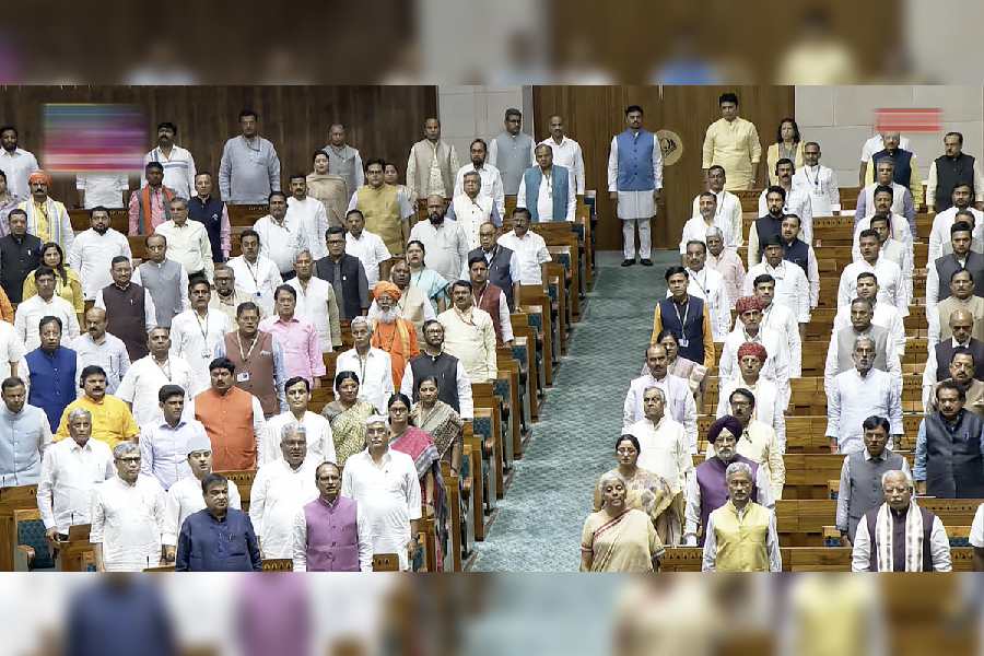 Members stand for the national anthem after President Droupadi Murmu's address to the joint sitting of Parliament, in New Delhi, Thursday, June 27, 2024. The government’s ambitious plans for high-speed rail networks were also highlighted. President Murmu announced feasibility studies for new bullet train corridors across the north, south, and east of India. Progress on the Ahmedabad-Mumbai High-Speed Rail Corridor was described as rapid, signaling a significant leap forward in India's transportation infrastructure.