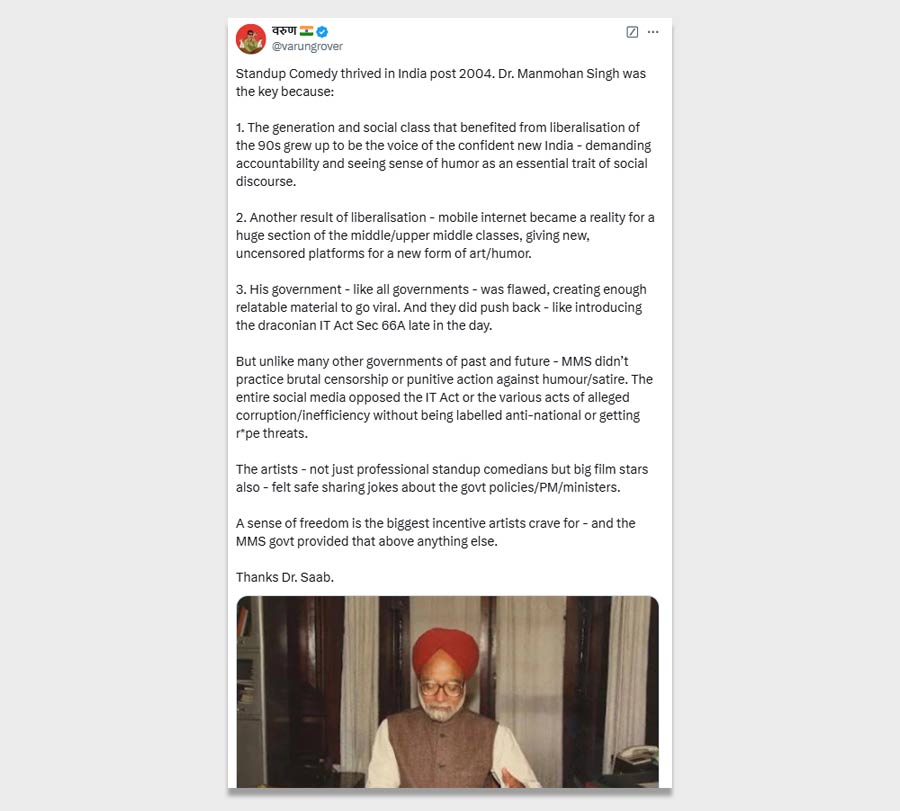 “Standup Comedy thrived in India post 2004. Dr. Manmohan Singh was the key because: 1. The generation and social class that benefited from liberalisation of the 90s grew up to be the voice of the confident new India - demanding accountability and seeing sense of humor as an essential trait of social discourse.