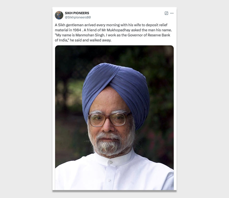 “A Sikh gentleman arrived every morning with his wife to deposit relief material in 1984. A friend of Mr. Mukhopadhyay asked the man his name. ‘My name is Manmohan Singh. I work as the Governor of Reserve Bank of India,’ he said and walked away.”