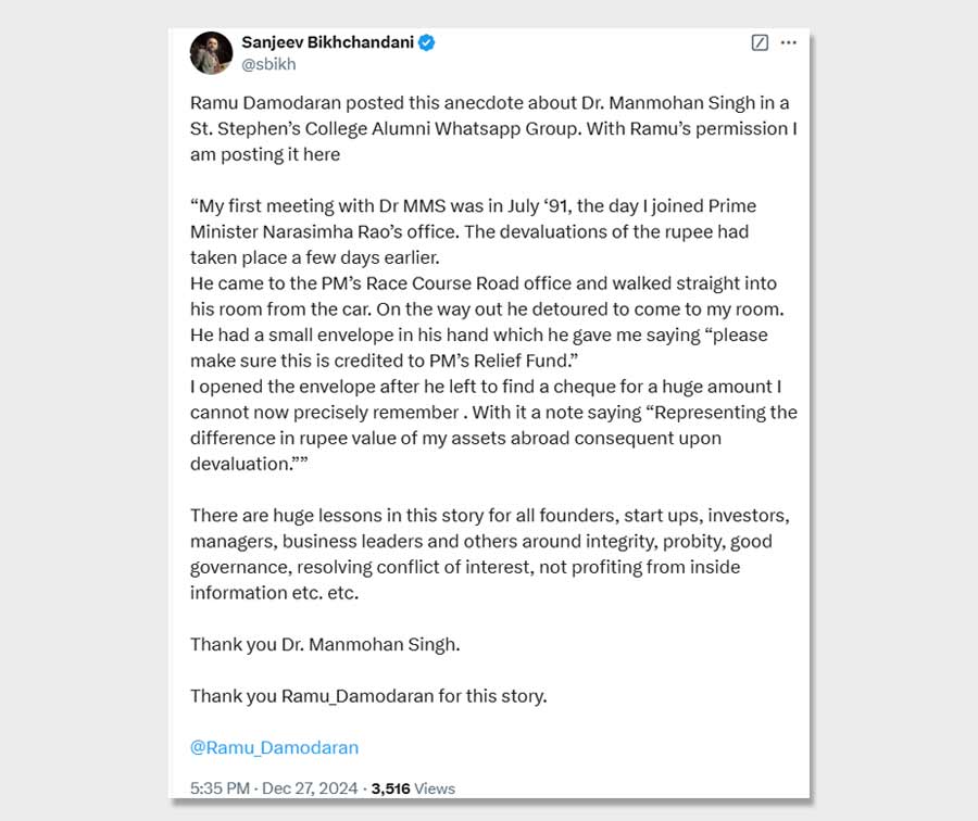 Sanjeev Bhikchandani, owner of the job portal Naukri.com, picked up an anecdote about Dr. Manmohan Singh that he received from Ramu Damodaran – a former IFS officer who had worked in the Prime Minister’s Office from 1991 to 1994 – in a St. Stephen’s College Alumni WhatsApp Group.