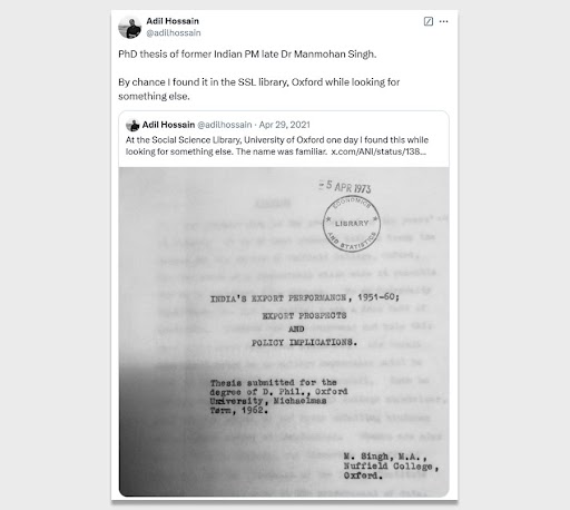 Academic Adil Hossain shared an image of Singh’s PhD thesis, titled: ‘India’s Export Performance, 1951-60; Export Prospects and Policy Implications.’.