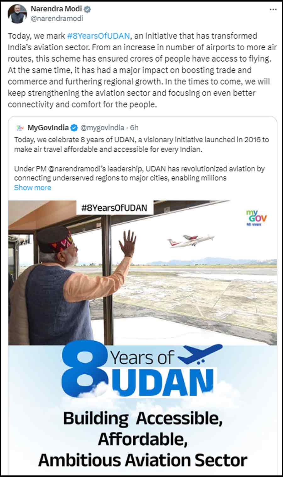 “Today, we mark #8YearsOfUDAN, an initiative that has transformed India’s aviation sector. From an increase in number of airports to more air routes, this scheme has ensured crores of people have access to flying. At the same time, it has had a major impact on boosting trade and commerce and furthering regional growth. In the times to come, we will keep strengthening the aviation sector and focusing on even better connectivity and comfort for the people.” Modi wrote on X.