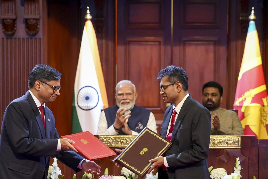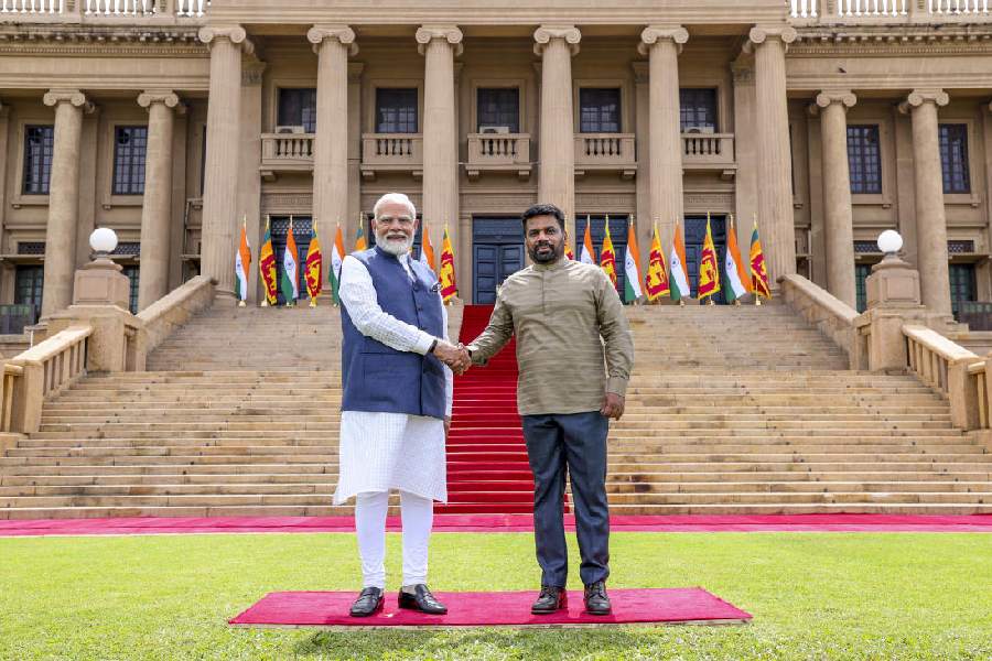In this image released by PMO on Saturday, April 5, 2025, PM Narendra Modi and Sri Lankan president Anura Kumara Dissanayake before delegation level talks at the Presidential Secretariat, in Colombo, Sri Lanka. (PTI)