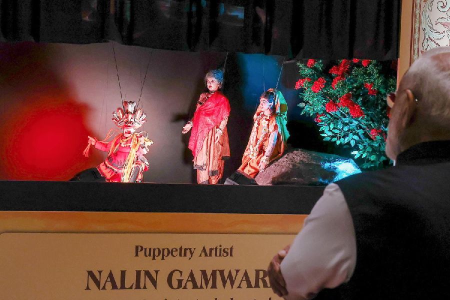 In this image released by PMO on Friday, April 4, 2025, PM Narendra Modi watches a puppet show during a community welcome event upon his arrival in Colombo, Sri Lanka. (PTI)