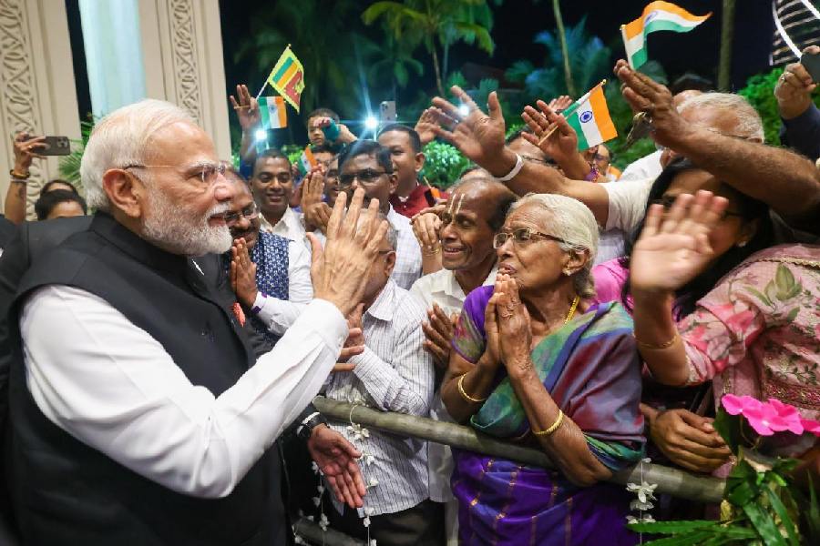 In this image released by PMO on Friday, April 4, 2025, PM Narendra Modi during a community welcome event upon his arrival in Colombo, Sri Lanka. (PTI)